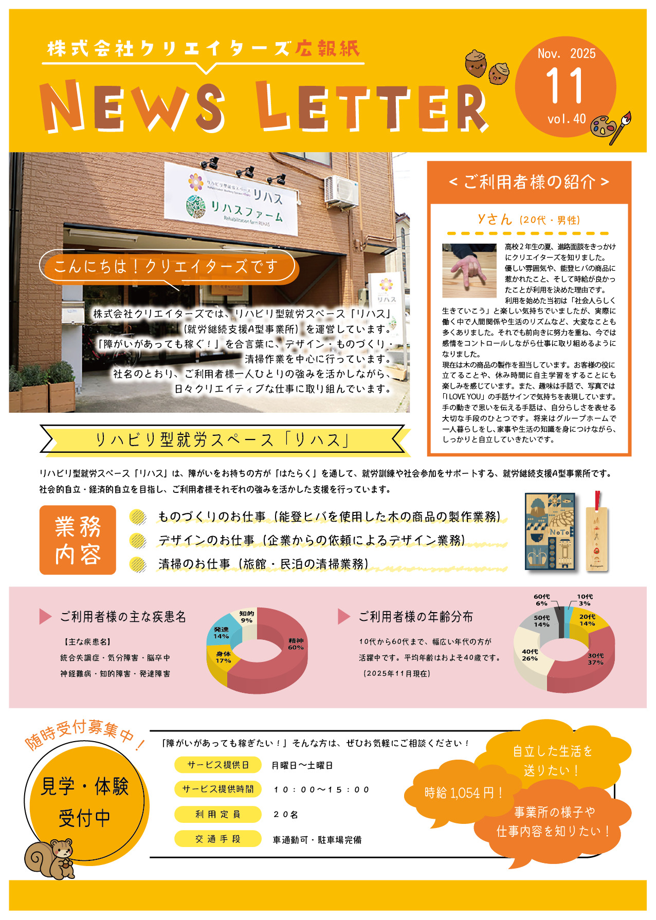 株式会社クリエイターズは「障がいがあっても稼ぐ!」を合言葉に、リハビリ型就労スペース「リハス」(就労継続支援A型)を運営しております。